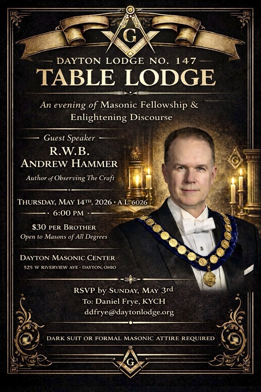 Dayton Lodge #147, F. & A.M., cordially invites you for a special evening of fellowship and refreshment at their upcoming Table Lodge. The guest speaker will be RWB Andrew Hammer, the best-selling Masonic author of “Observing The Craft”.