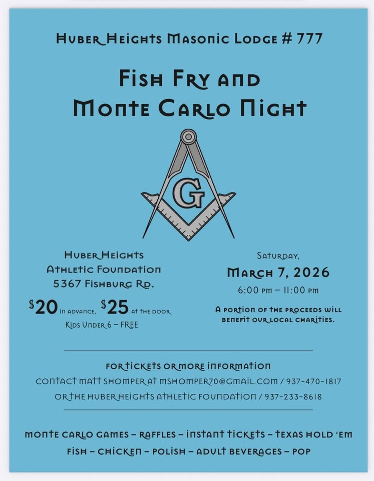 Huber Heights Fish Fry February 5, 2026 Bruce Hall Come to Huber Heights #777’s Fish Fry and Monte Carlo Night on Saturday, March 7th 2026 from 6-11 PM. Tickets are $20 in advance and $25 at the door. See you there!